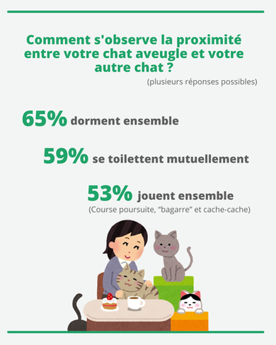 Cela dit, il nây a pas forcĂ©ment besoin dâune histoire commune pour que les chats aveugles crĂ©ent une proximitĂ© avec les congĂ©nĂšres dans le foyer. Pour dĂ©finir la proximitĂ© dans l'enquĂȘte, elle est observable Ă partir du moment oĂč les chats dorment et jouent ensemble et se toilettent mutuellement.